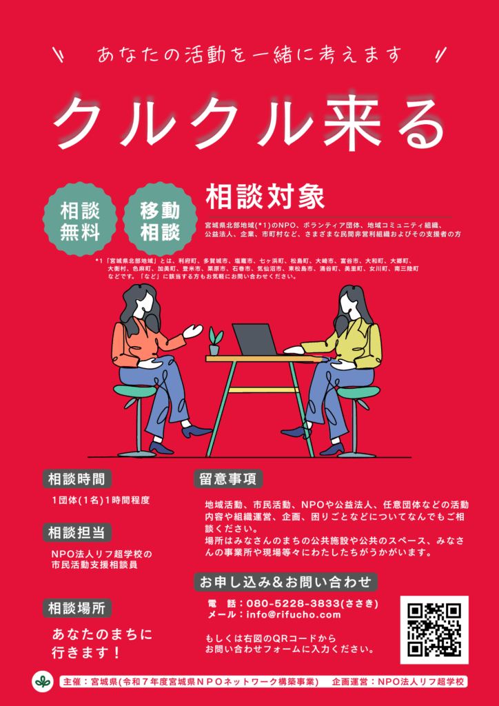 私たちは、現在宮城県のNPOネットワーク構築事業として、市民活動団体や町内会など様々な非営利団体の相談を移動訪問型相談「クルクル来る」で実施しており、今回のイベント協力もその支援プログラムの一環です。地域活動の新しい形を模索する町内会を、イベントという形で一緒に盛り上げていきます!